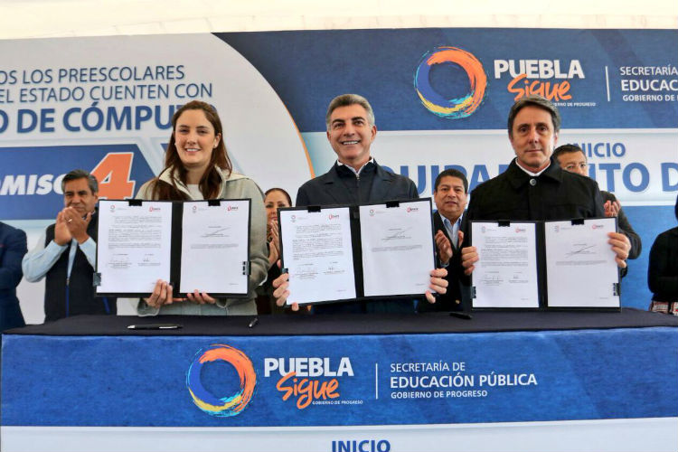 Acompañado de su esposa Dinorah López de Gali, Presidenta del Patronato del Sistema Estatal DIF, entregó computadoras al jardín de niños "Yolanda Benítez Gutiérrez" de la inspectoría Los Ángeles Tetela del municipio de Puebla, en colaboración con la asociación Únete, que beneficiará a más de 170 infantes.