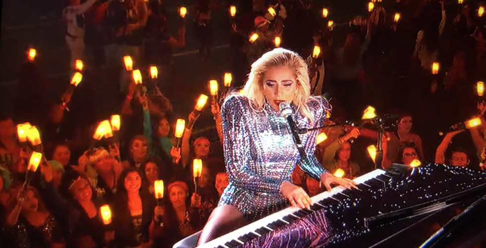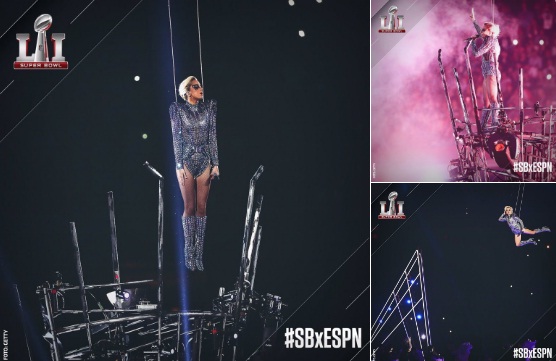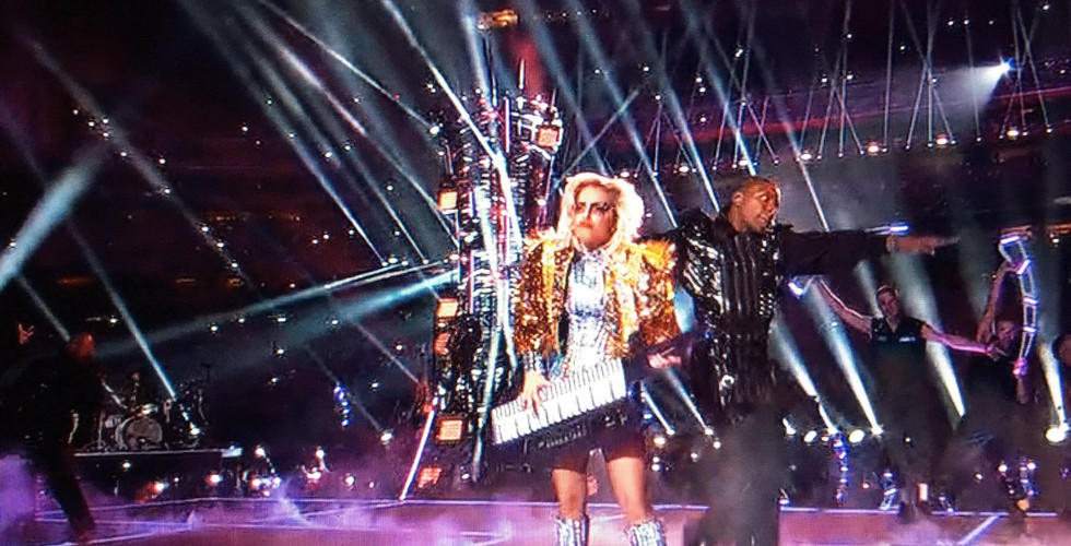 Mientras los equipos descansaban en los vestidores, Stefani Joanne Angelina Germanotta, mejor conocida como Lady Gaga, saltó a un escenario multicolor y profusamente iluminado con un espectáculo de luces provistas por decenas de drones que sobrevolaron el escenario.