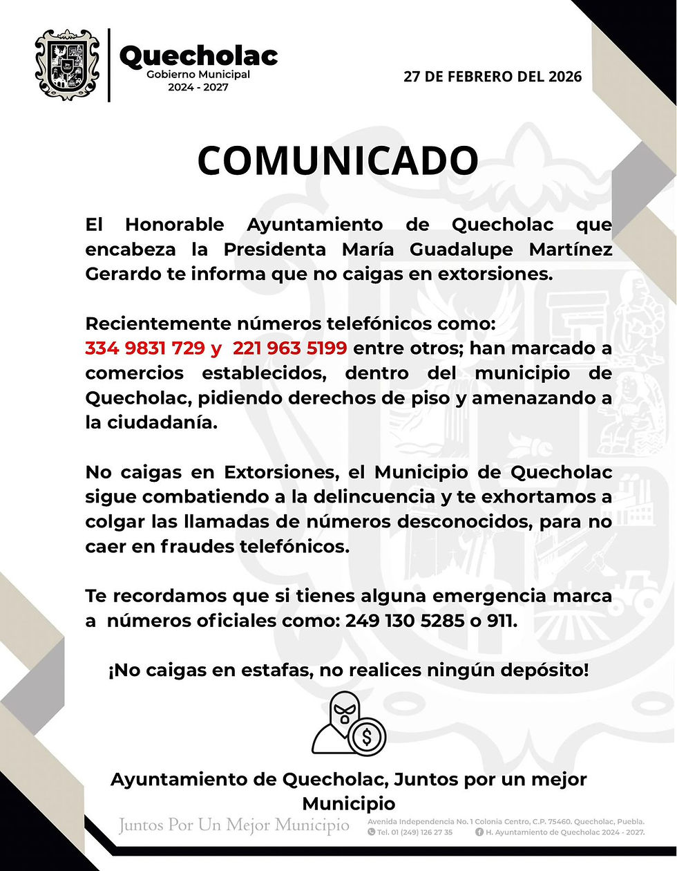 Quecholac, Pue.- El Honorable Ayuntamiento de Quecholac, encabezado por la presidenta municipal María Guadalupe Martínez Gerardo, alertó a la población sobre intentos de extorsión telefónica dirigidos a comercios establecidos en el municipio.
