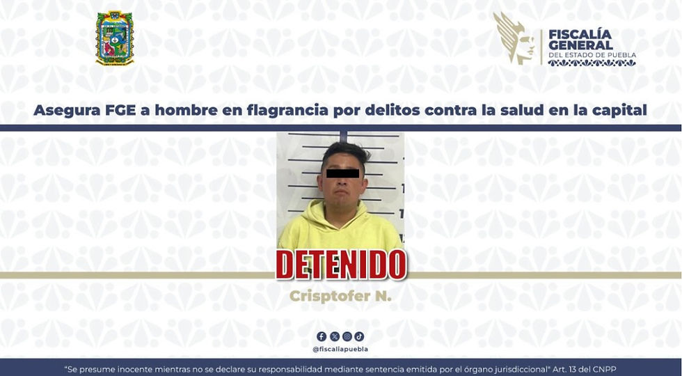 Puebla, Méx.- Durante acciones de vigilancia en la ciudad de Puebla, la Fiscalía General del Estado (FGE) detuvo en flagrancia a Crisptofer N., de 32 años, como probable responsable de delitos contra la salud en su modalidad de suministro de narcótico.