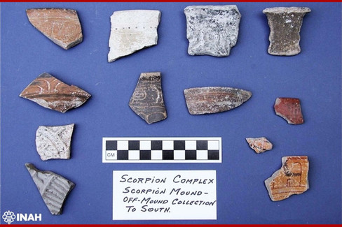 El escorpión integra un conjunto de 11 montículos distribuidos en aproximadamente nueve hectáreas, algunos con evidencias de habitaciones y muros. También se halló un pozo de uso desconocido y una ofrenda moderna compuesta por vasijas con tabaco y chiles, muestra de la permanencia cultural del sitio.