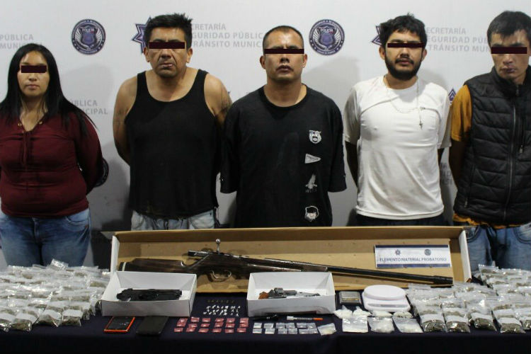 Una vez controlada la situación, los oficiales lograron el aseguramiento de los siguientes artículos y sustancias: 132 envoltorios de posible marihuana, 33 de crack, 22 de heroína, cinco más de cocaína, dos básculas electrónicas, una jeringa para insulina y una pipa; un arma tipo escopeta, dos revólveres calibres 38 y 22 milímetros junto con 12 cartuchos útiles, dos armas tipo pistola, dos objetos puzocortantes; dos teléfonos celulares, dos billeteras, dos mochilas, dos cosmetiqueras, un bolso, identificaciones, tarjetas bancarias y de tiendas departamentales, así como herramienta diversa.