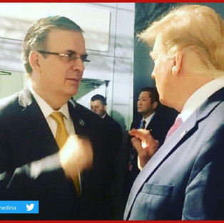 En dos fotografías subidas a Twitter por el jefe de oficina de secretario de la cancillería, Gonzalo Fabián Medina Hernández, se ve a Ebrard y Trump sonrientes y saludándose.