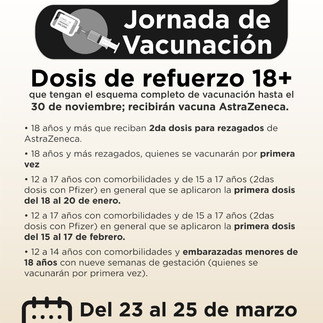 • 18 años para 3ra dosis y que tengan el esquema completo de vacunación hasta el 30 de noviembre; recibirán vacuna AstraZeneca.