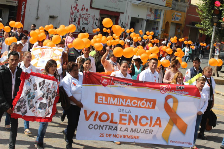 Quecholac, Pue.- El presidente municipal de Quecholac, Alejandro Martínez acompañado de su esposa, la titular del Sistema Municipal DIF, Areli Barrera, encabezaron este lunes una marcha por el zócalo del municipio en conmemoración de la Eliminación de la Violencia contra la Mujer.