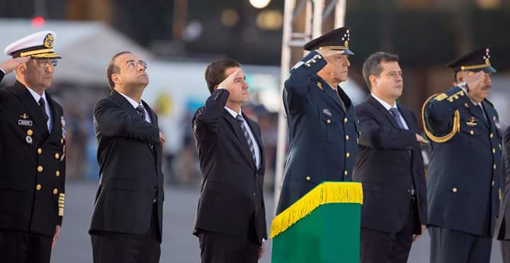 A las 7:18 horas, el primer mandatario salió de Palacio Nacional hacia el asta bandera del Zócalo capitalino, acompañado por los secretarios de Gobernación, Alfonso Navarrete Prida; de la Defensa Nacional, Salvador Cienfuegos Zepeda, y de Marina, Vidal Francisco Soberón Sanz.