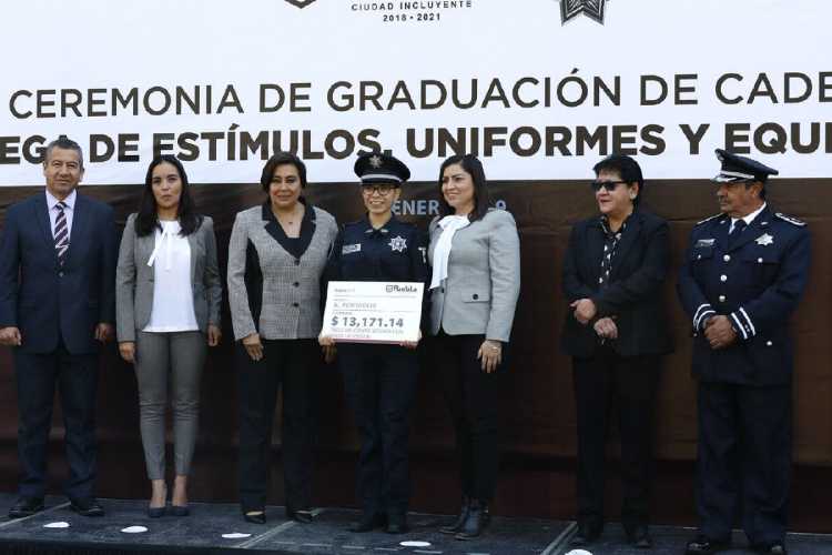 Puebla, Méx.- Con el objetivo de fortalecer la seguridad en la capital a favor de las y los poblanos, este miércoles la Presidenta Municipal, Claudia Rivera Vivanco, presidió la entrega de estímulos, uniformes y equipamiento de la Policía Municipal y la graduación de 17 cadetes que se integran a las fuerzas municipales.