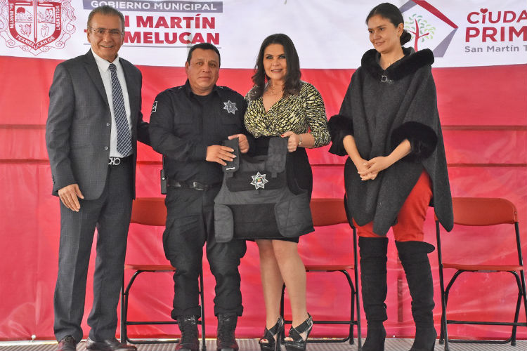 La alcaldesa hizo entrega de 2 patrullas, 55 chalecos antibalas, un radio móvil para patrulla, equipo de cómputo para alimentar y mantener una base de datos, 52 candados de mano (es-posas), 56 bastones (macanas) y 50 lámparas.