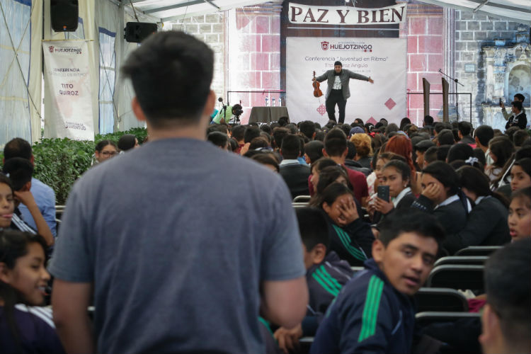 Huejotzingo, Pue.- En la Explanada del Ex-Convento de San Miguel Huejotzingo y al menos 400 jóvenes del Municipio, se presentó la Conferencia "Juventud en Ritmo" a cargo de Tito Quiróz Angulo destacado conferencista, músico y Premio Nacional de la Juventud 2015, quien a través de la música promueve cambios positivos en la sociedad.